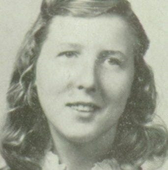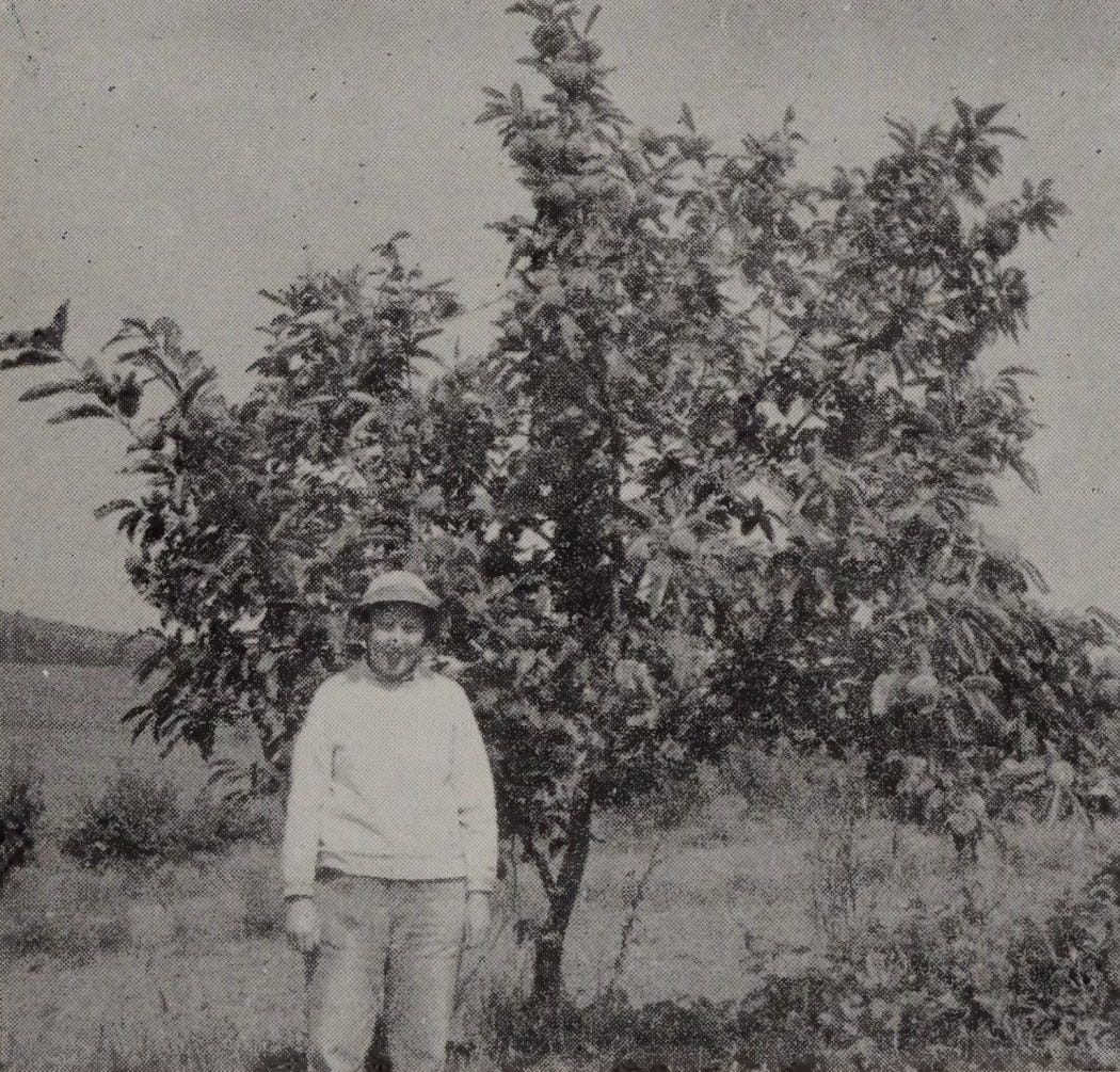 Here she is pictured with an Asian persimmon tree in the 1951 nursery catalog, and the other photo is from her high school yearbook.]